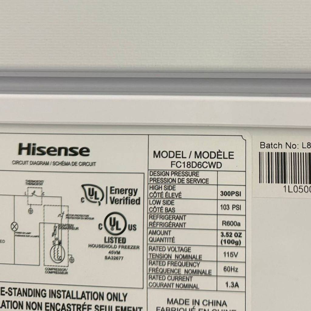 Open Box Hisense 17.7 cu ft. White Convertible Chest Freezer or Fridge Model No. FC18D6CWD S/N: 1L050002C01JL835NS40048