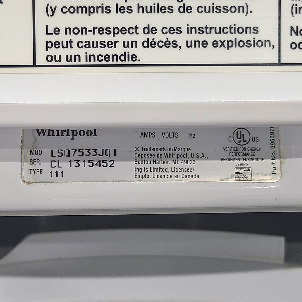 Used Whirlpool Washer and Dryer Set Model No. LSQ7533JQ1 - YLER4634JQ0